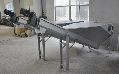 砂水分離器設(shè)備一般螺旋傾角為25~30°之間,砂水混合液從進(jìn)水管進(jìn)入本設(shè)備,混合液通過(guò)分離機(jī)上部的聚集箱,在水流的作用下,使混合液的砂粒與有機(jī)物進(jìn)行分離,砂水進(jìn)入集砂槽中,比重較大的顆粒(如砂粒)由于自重而下降,沉積于螺旋槽底部,在螺旋葉片的推動(dòng)下,物料沿斜置的U型槽底部提升,離開(kāi)液面后,繼續(xù)上移一段距離,砂粒中的水分逐漸在螺旋槽葉片的空隙中流回水箱,砂粒液逐漸干化到出料口處,依靠自重落入其他輸送裝置中,上清液則不斷從排水堰溢流出去,有機(jī)物在水流漩渦的作用下,也跟著上清液從溢流槽流出,回流至污水井中,從而達(dá)到砂水分離的作用。