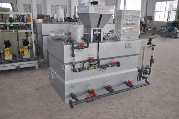 干粉絮凝劑從螺旋推進器內進入速溶器內與清水進行預混,被濕潤的物料進入配制槽進行攪拌稀釋,按要求濃度進行配制;配制過程中,進水量在流量計觀測下必須相對穩(wěn)定,從而保證在整個工作工程中,配制溶液濃度不變。