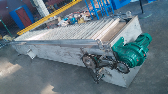 網(wǎng)板式階梯格柵機(jī)能清除漂浮物、纖維物質(zhì),運(yùn)行時(shí)不堵塞雍水,能將柵渣清除干凈。主要由驅(qū)動(dòng)裝置、機(jī)架、傳動(dòng)鏈輪、牽引鏈條、網(wǎng)板及電氣控制柜等主要部件組成。工作時(shí)網(wǎng)板在二側(cè)傳動(dòng)鏈條的帶動(dòng)下,自下而上將整個(gè)渠道寬度范圍內(nèi)的污物向上提取,抵達(dá)上部時(shí),通過(guò)鏈輪的轉(zhuǎn)向功能,自動(dòng)完成卸污工作。
